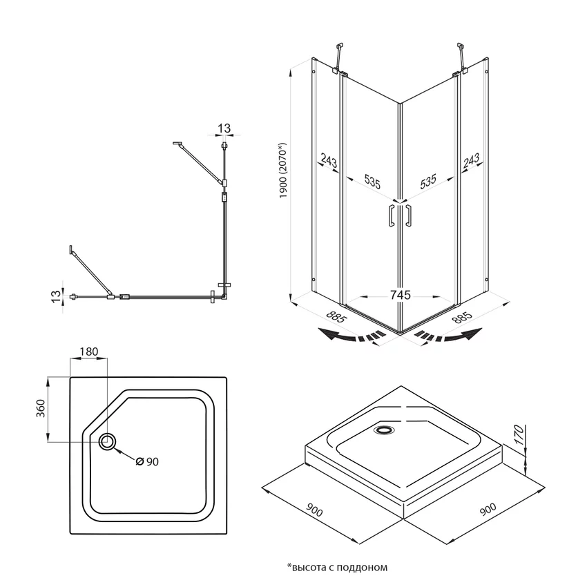 ДЛИНА 900 мм ШИРИНА 900 мм ВЫСОТА 1900 мм ФОРМА Квадрат ТОЛЩИНА СТЕКЛА 6 мм МАТЕРИАЛ ПРОФИЛЯ Алюминий ЦВЕТ ПРОФИЛЯ Чёрный ШИРИНА ДВЕРНОГО ПРОЁМА 535 мм КОЛИЧЕСТВО ДВЕРЕЙ 2 шт МЕХАНИЗМ ОТКРЫТИЯ ДВЕРЕЙ Подъемно-поворотный КОНСТРУКЦИЯ ДВЕРЕЙ Распашная РИСУНОК СТЕКОЛ Без рисунка